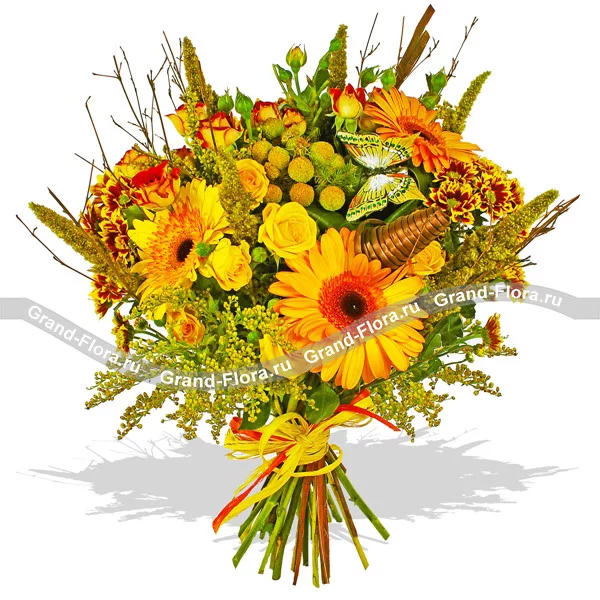 Стандартный: гербера оранжевая/или желтая - 3шт., хризантема оранжевая/желтая кустовая - 3шт., роза желтая кустовая - 2шт., роза оранжевая кустовая - 2шт., декоративные украшения и зелень( возможно отличие от фото), , лента.